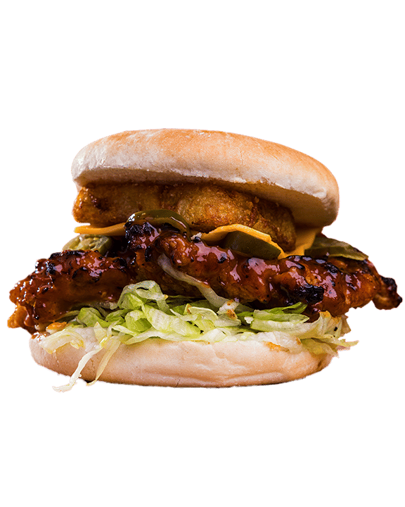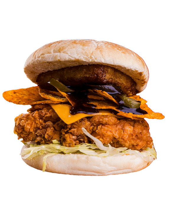 Brioche Bun, spicy chicken tenders, Hot Syrup, Gherkins, Mayo, cheese