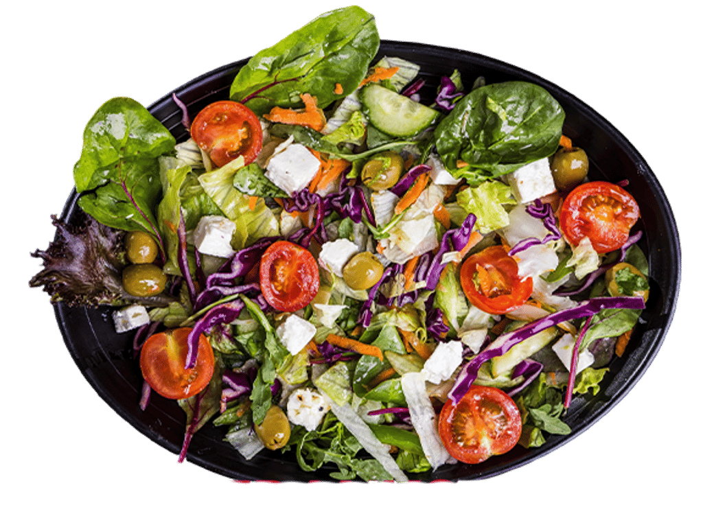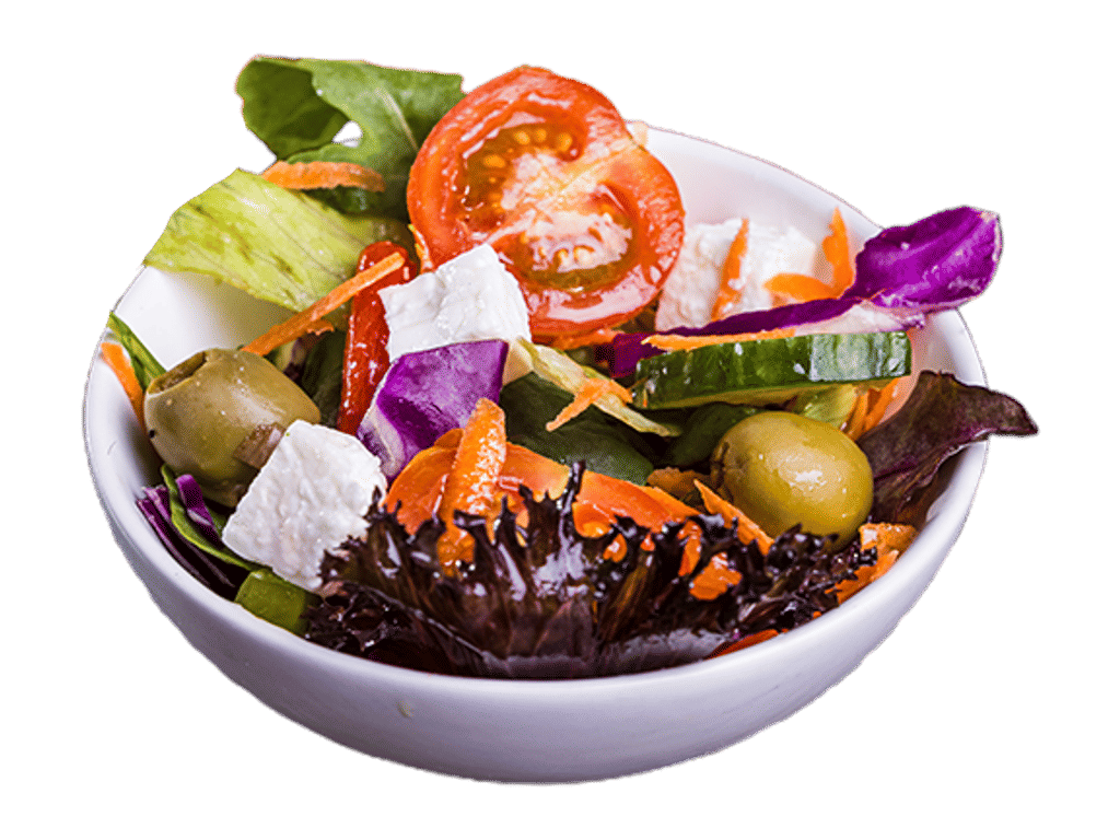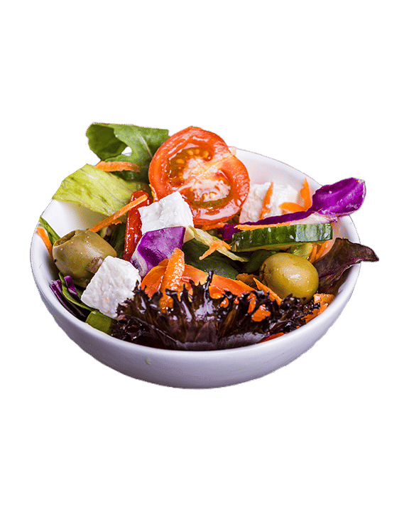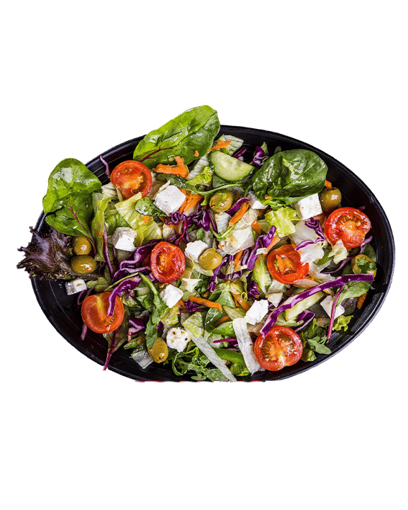 Mixed Leaf Salad, Olives, Feta, Cucumber, Red Onions, Tomato, Peppers.