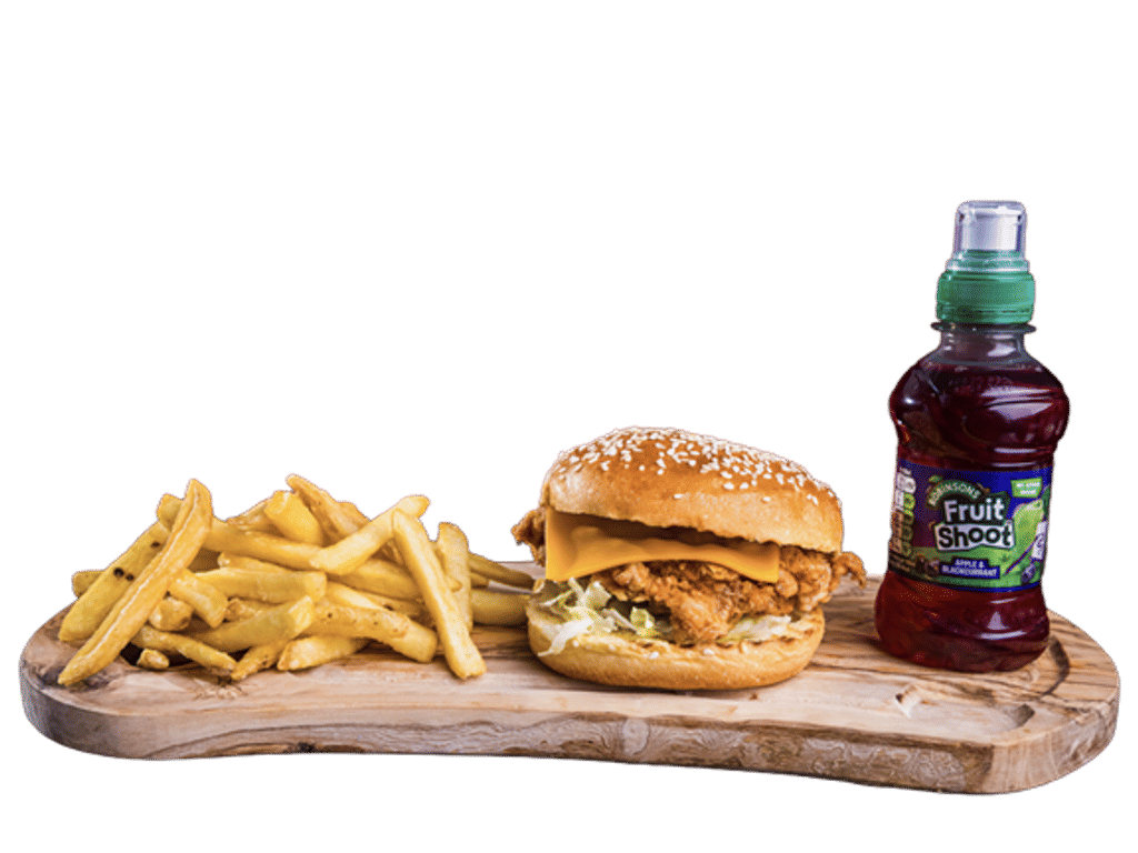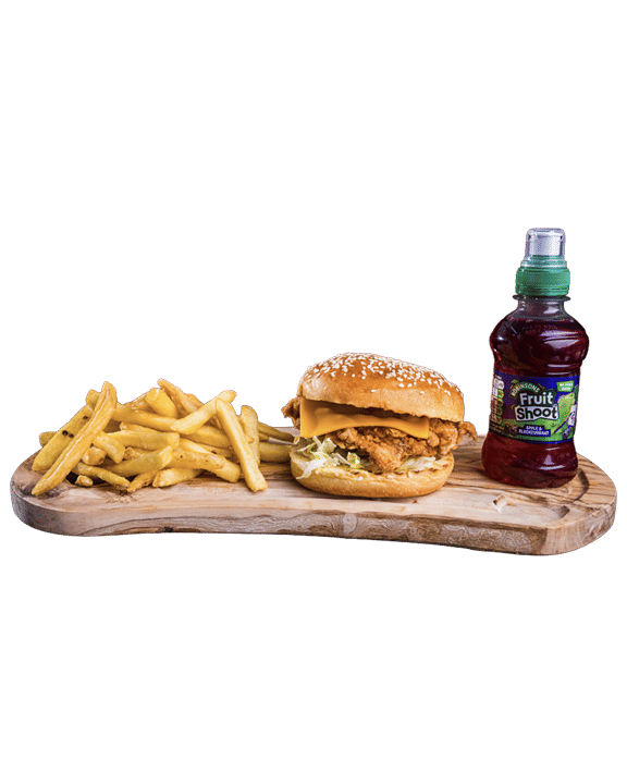 Chicken Fillet, Cheese, Lettuce, Mayo. Served with fries & a kids drink (Fruitshoot)
