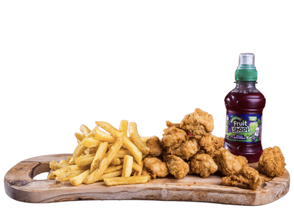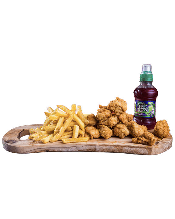 Popcorn Chicken. Crispy Chicken pieces Served with fries & a kids drink (Fruitshoot)