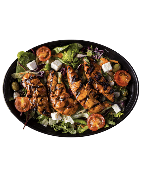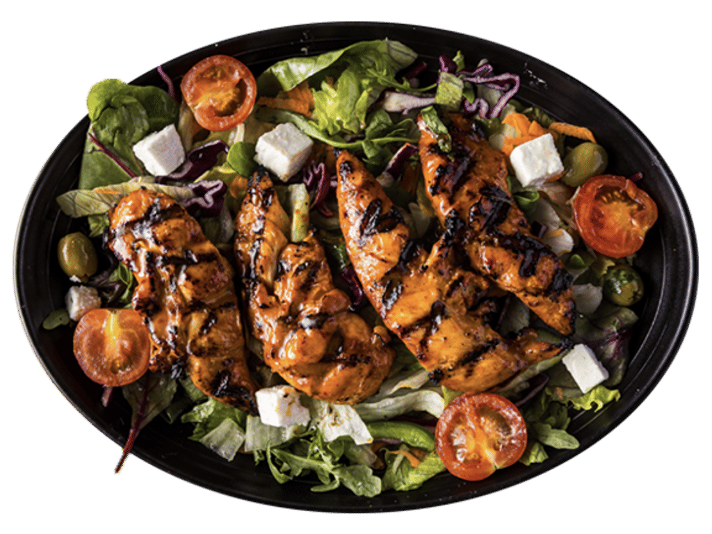 Chicken, Mixed Leaf Salad, Olives, Feta, Cucumber, Red Onions, Tomato, Peppers.