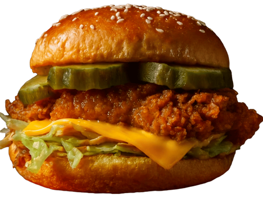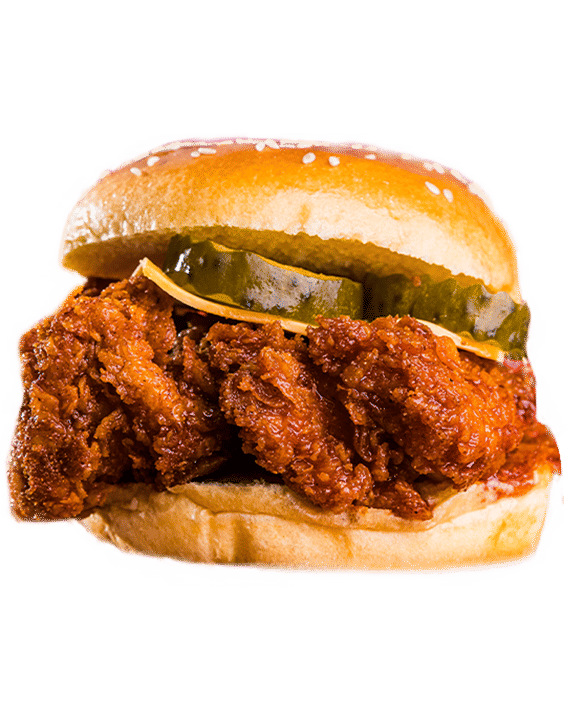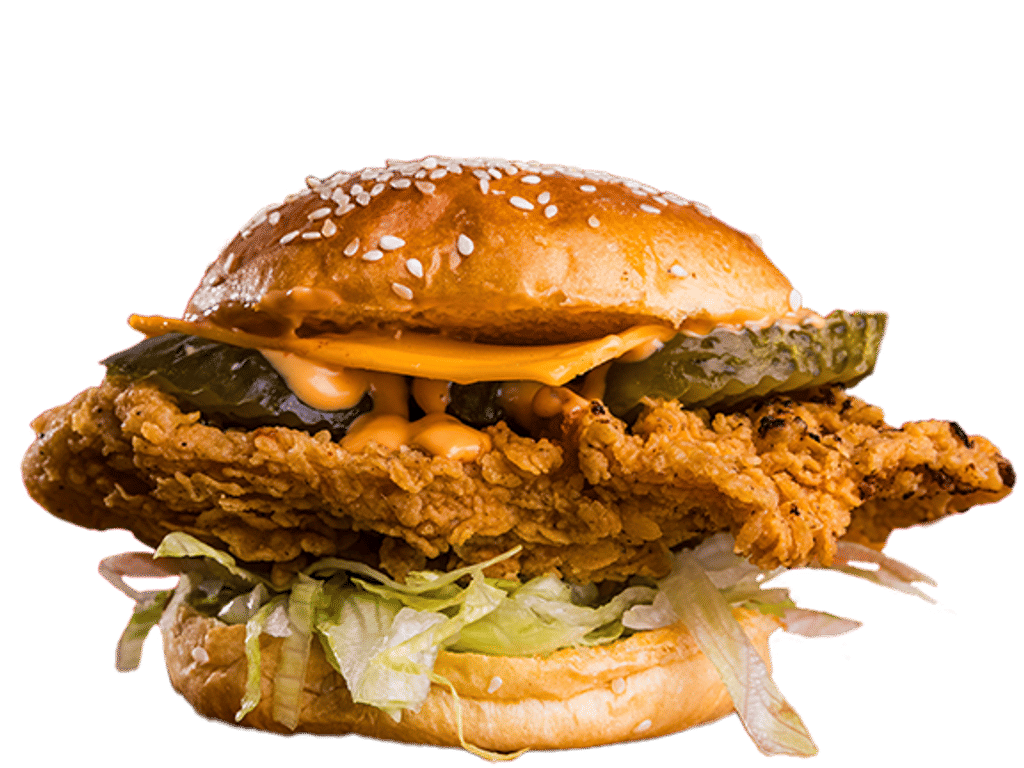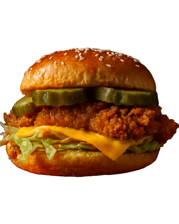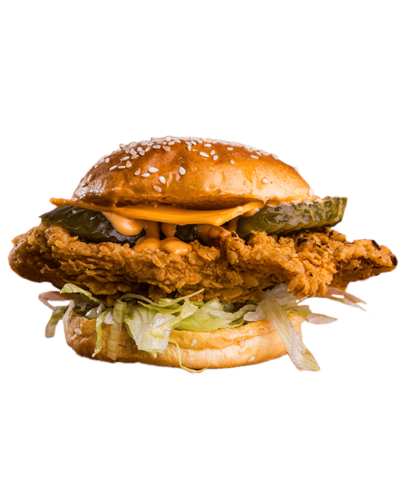 Potato bun, spicy chicken tenders, Gherkins, Special sauce, cheese