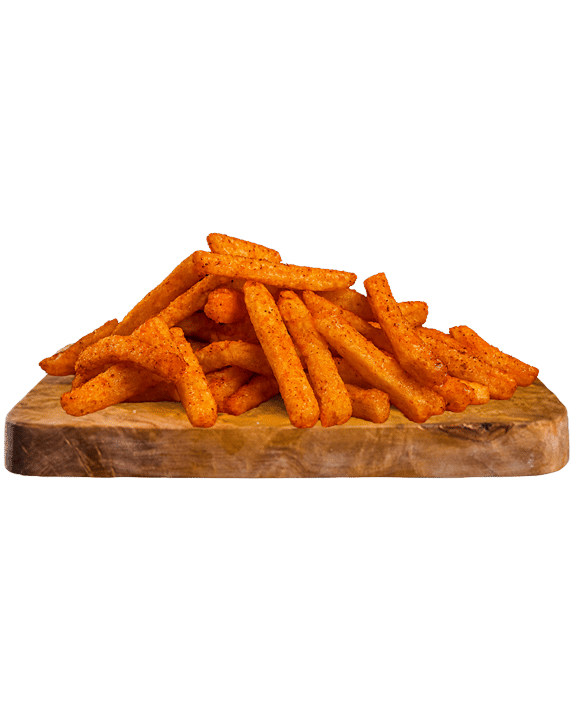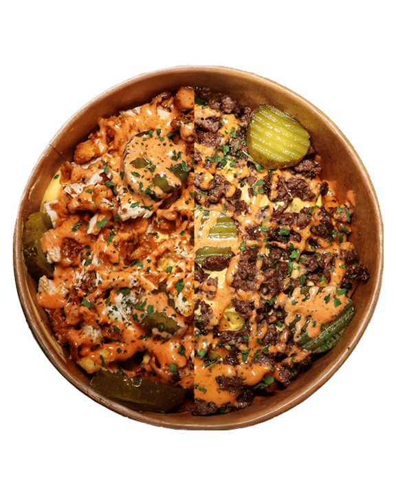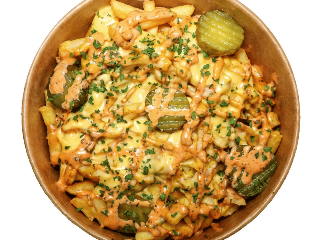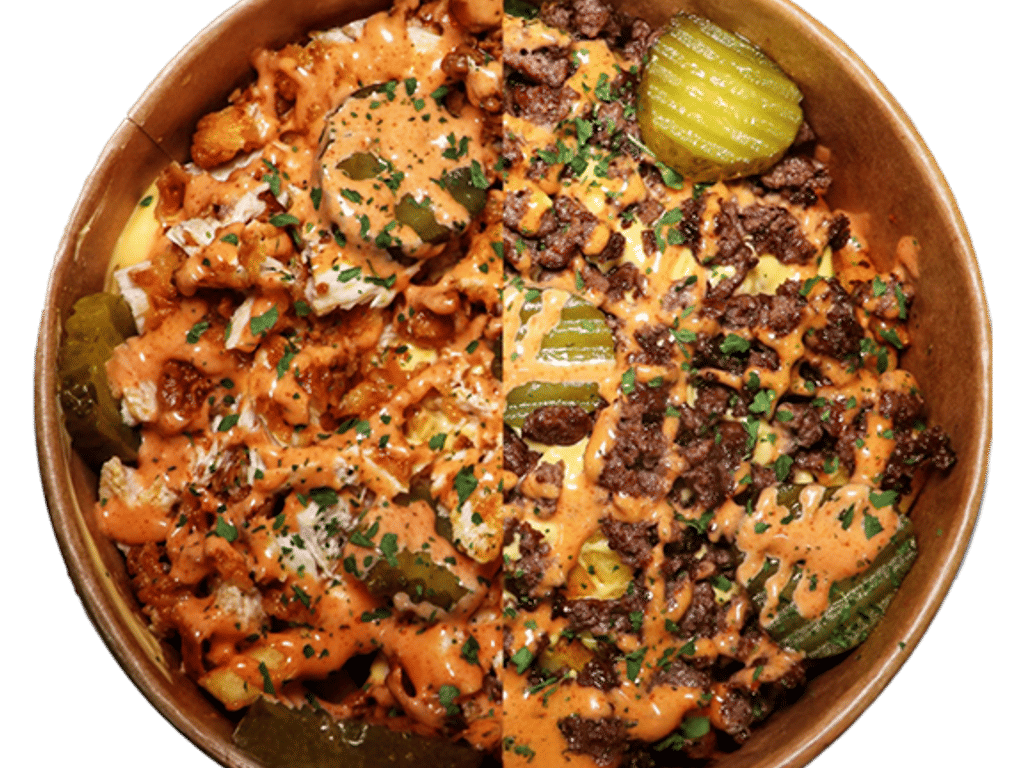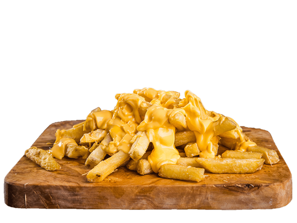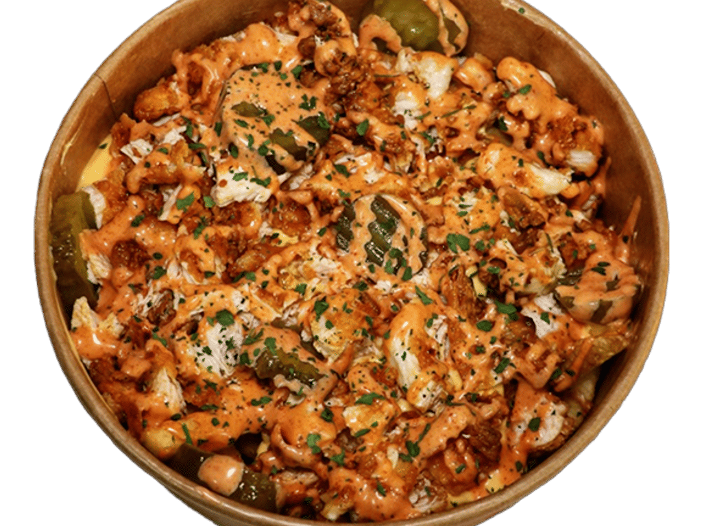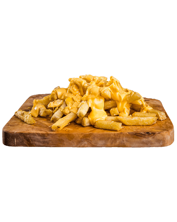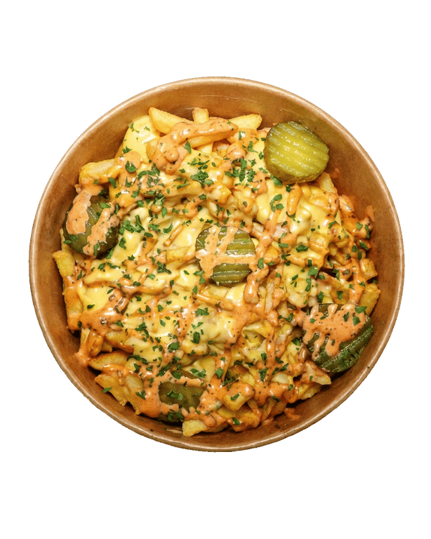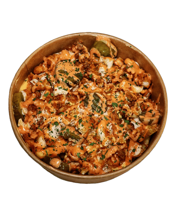 Cajun spice Skin on Fries Served with Cheese Sauce, Spicy mayo sauce, Gherkins, Parsley Angus Beef/Nashville Strip