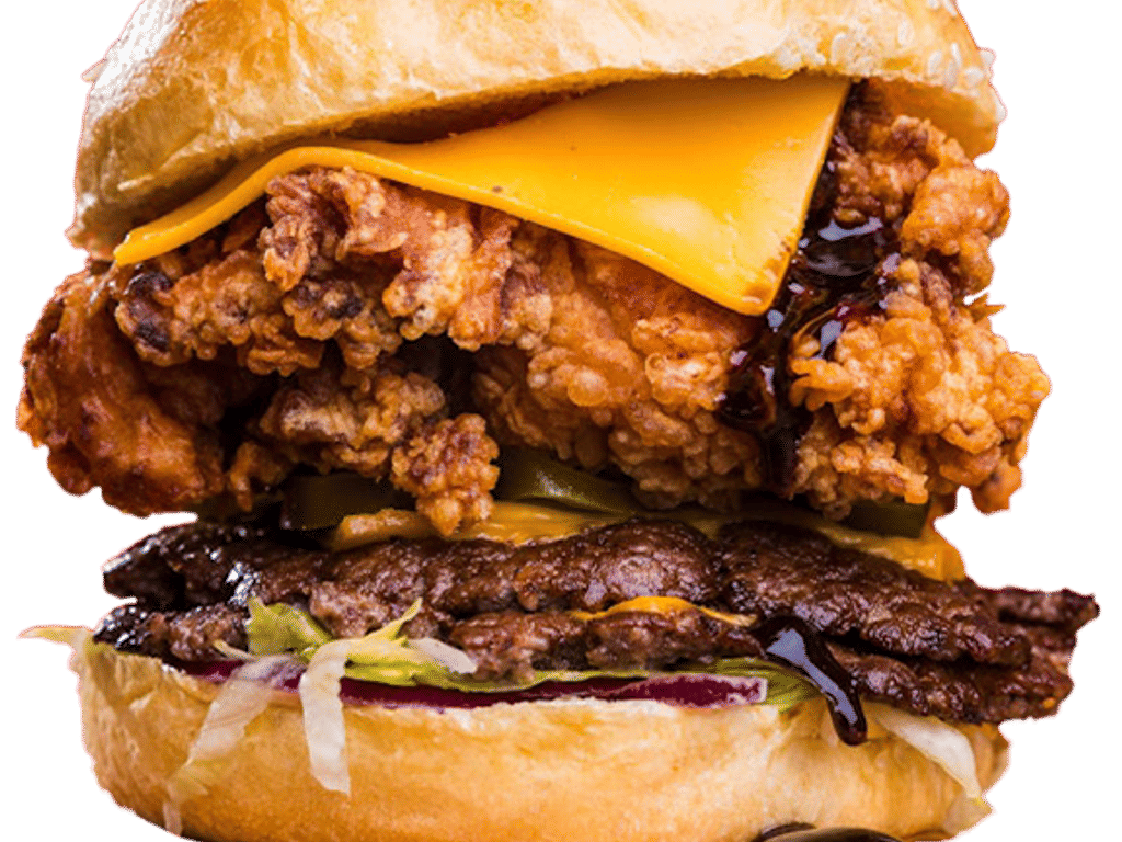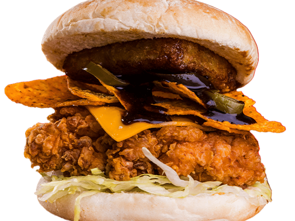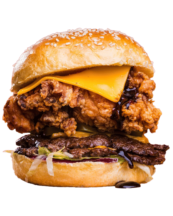 2*2.5oz Angus Smash Patty, Fried Chicken Filet, Cheese, Buffalo Sauce, Frankster’s Sauce, Red Onions, Jalapeños, Lettuce.