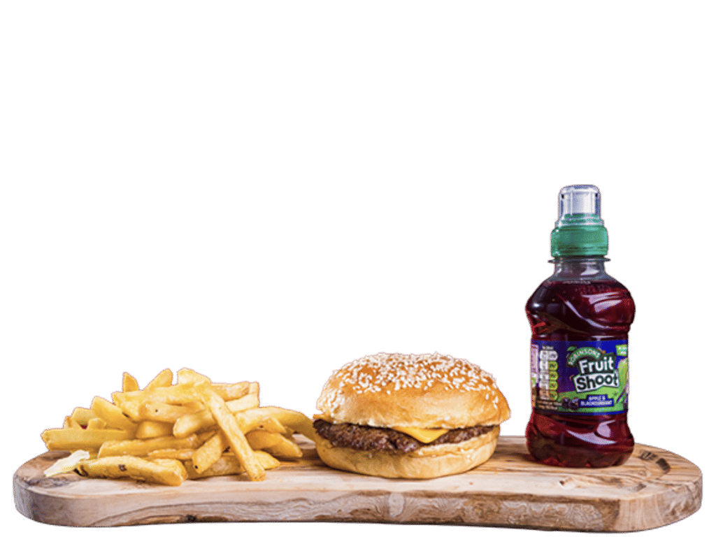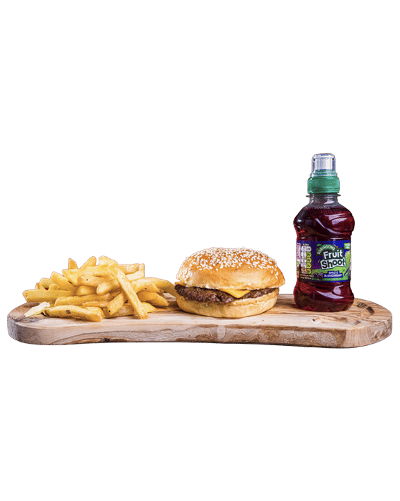 1 * 2.5oz Angus Smash Patty, Cheese. Served with fries & a kids drink (Fruitshoot)