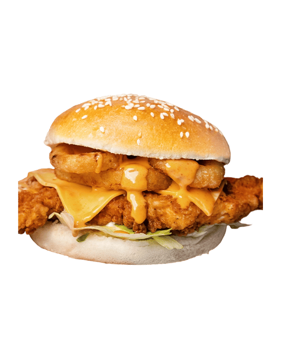 Spicy Fried Chicken Fillet, Hash Brown, Franksters sauce, Cheese, Mayo, Onion Rings, Lettuce